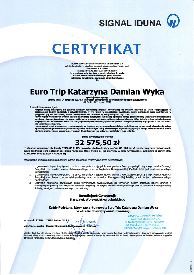 Nasze biuro posiada wpis do Rejestru Organizatorów Turystyki pod Nr. 286 wydany przez Marszałka Województwa Lubelskiego. Specjalizujemy się głównie w turystyce krajowej dzieci i młodzieży, gdyż jesteśmy zdania, że na mapie Polski znajduje się mnóstwo ciekawych miejsc, które warto odwiedzić. W naszej ofercie znajdziecie Państwo wycieczki mające charakter edukacyjny, których celem jest poznawanie historii, kultury oraz obyczajów. Na Państwa życzenie jesteśmy w stanie zmodyfikować każdy program wycieczki lub ułożyć nowy, uwzględniając Państwa upodobania oraz budżet. Podane ceny dotyczą wyjazdów z Zamościa i bliskich okolic.